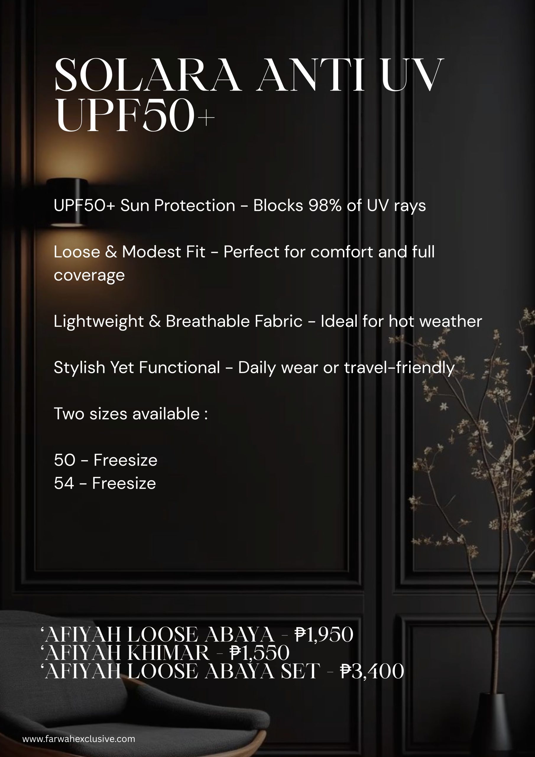 Experience effortless elegance with the ‘Afiyah Loose Abaya—designed for your precious skin with its UPF50+ that protect your skin from harmful rays which blocks 98% of UV RAYS.